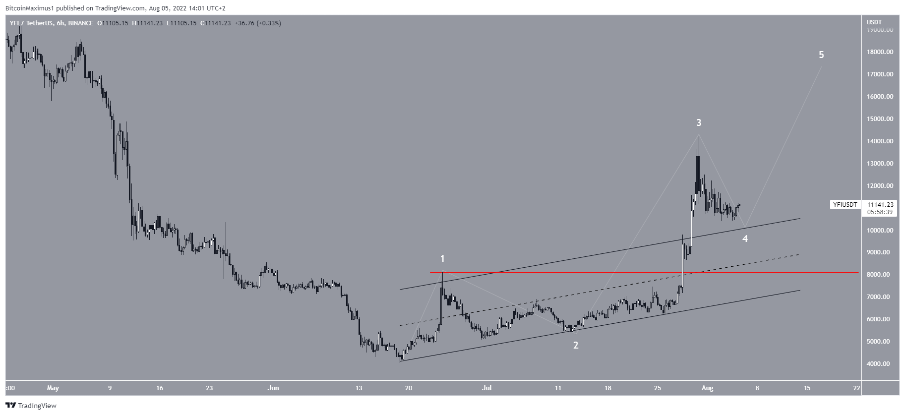 O YFI vinha subindo dentro de um canal paralelo ascendente desde 18 de junho. Saiu desse canal em 29 de julho e atingiu uma alta de US$ 14.200 no dia seguinte.