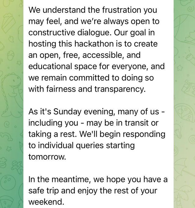 Pessoalmente, me senti decepcionado e desvalorizado. Se um hackathon visa construir uma comunidade e apoiar os construtores, a transparência e a comunicação clara são fundamentais. Alterar os valores das recompensas sem aviso quebra a confiança que depositamos como contribuidores, concluiu um dos participantes.
