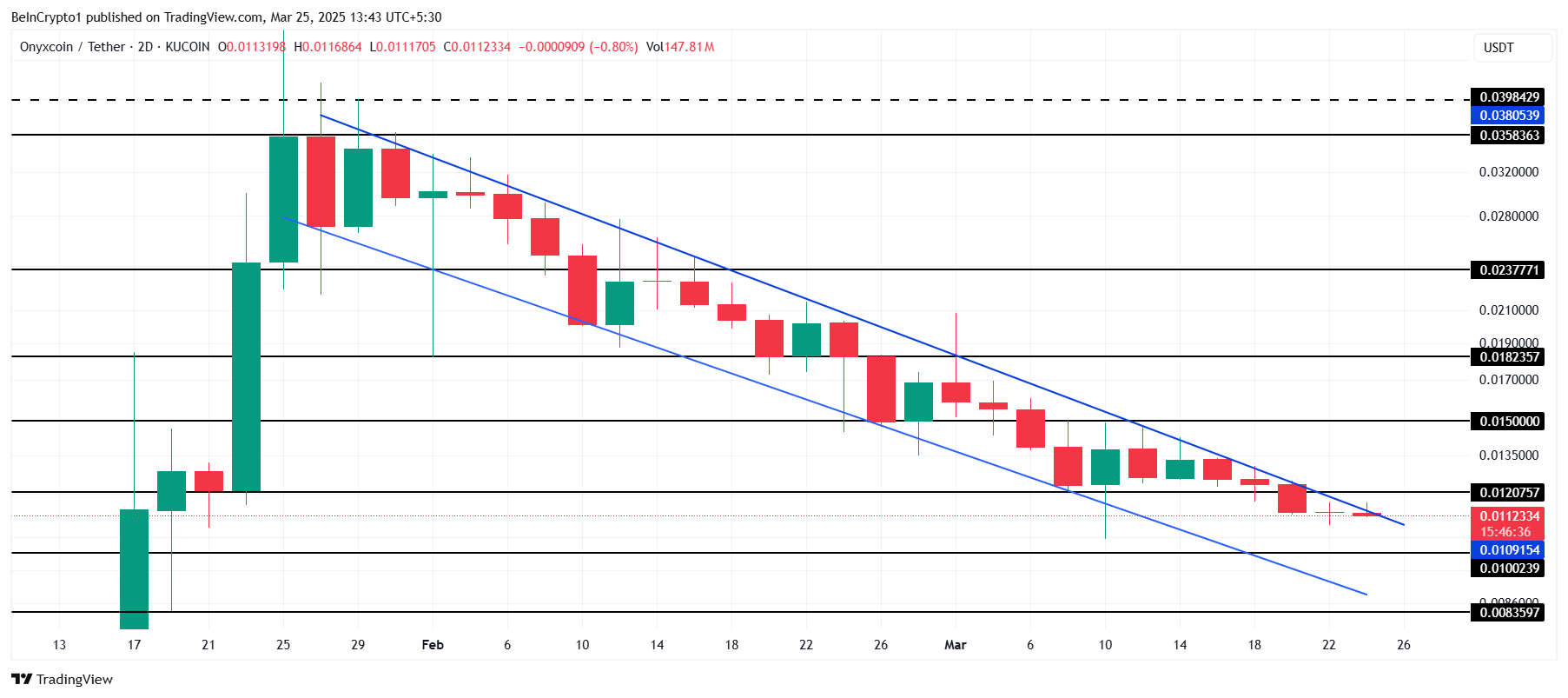 O preço da Onyxcoin está cotado atualmente em US$ 0,0112, dentro de uma cunha descendente. Essa tendência de baixa persiste há oito semanas, com a altcoin falhando repetidamente em superar a resistência de US$ 0,0120. Essa faixa de preço tem sido uma barreira persistente e, até que consiga rompê-la, é provável que continue abaixo desse nível.