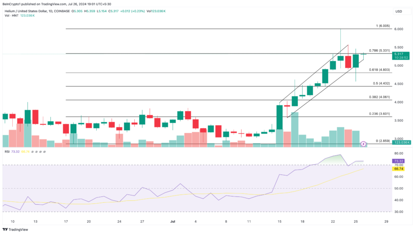 Atualmente, a HNT está sobrecomprada, sugerindo que um retrocesso pode ser o próximo para o token. Consequentemente, o valor da altcoin pode cair para US$ 4,79. No entanto, se a pressão de compra aumentar, o preço poderá tentar testar novamente os US$ 6.