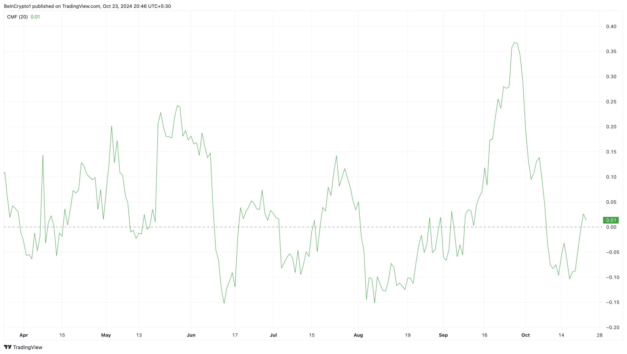 No dia 19 de outubro, o Chaikin Money Flow no gráfico diário do Ethereum caiu para -0,10. Popularmente chamado por sua forma abreviada, o CMF mede a taxa de fluxo de capital para dentro e para fora de uma criptomoeda.