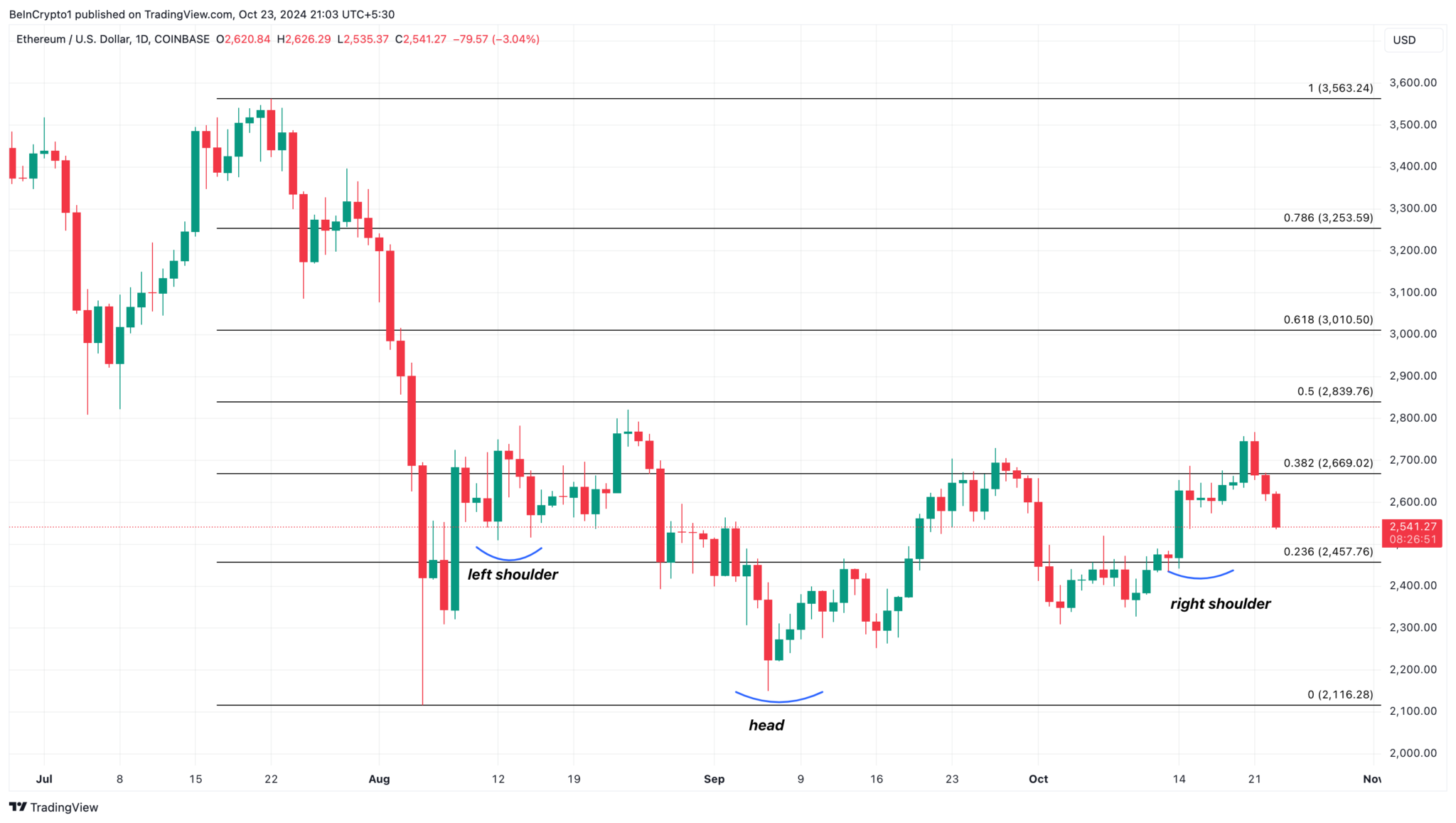 Atualmente, o preço do Ethereum está em torno de US$ 2.556. No gráfico diário, o ETH formou um padrão de cabeça e ombros invertidos, um padrão técnico de reversão de baixa para alta.