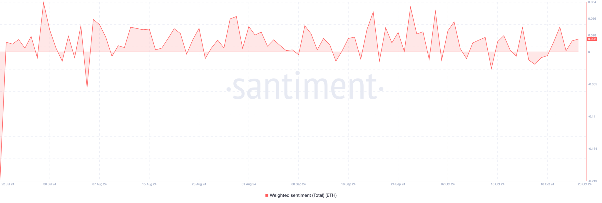 O Sentimento Ponderado é outra métrica que sugere que o preço do ETH pode se recuperar. Essa métrica mede a percepção que os participantes do mercado têm sobre uma criptomoeda. Quando aumenta, o sentimento mais amplo é otimista e pode levar ao aumento da demanda