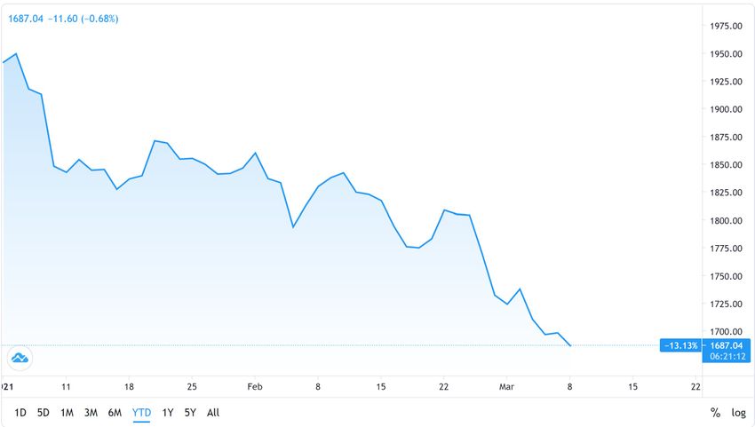 Nesta segunda-feira, 8 de março, o ouro está sendo negociado a US$ 1.687 a onça. Com esse valor atual, o ouro já perdeu mais de 11% do valor no acumulado do ano.
