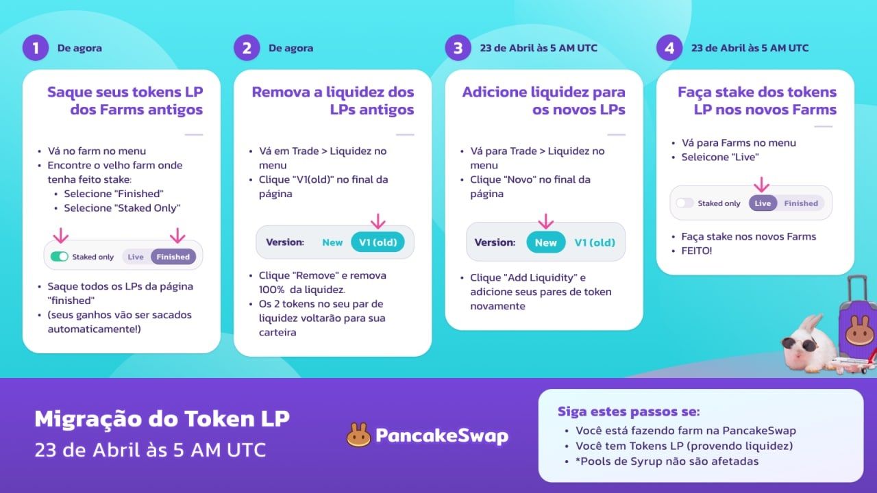 A nova versão da PancakeSwap vai migrar o conjunto de Smart Contracts para melhorar os incentivos e diminuir taxas de transações. Caso não haja migração para os novos pools de liquidez, os usuários não receberão recompensas.