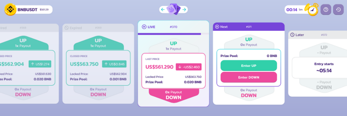 - Se um usuário entrar em uma posição “otimista” e o “preço acordado” do BNB/USDT for maior do que o “preço bloqueado” no final da fase ao vivo de 5 minutos, o usuário ganha e, se for menor, ele perde.