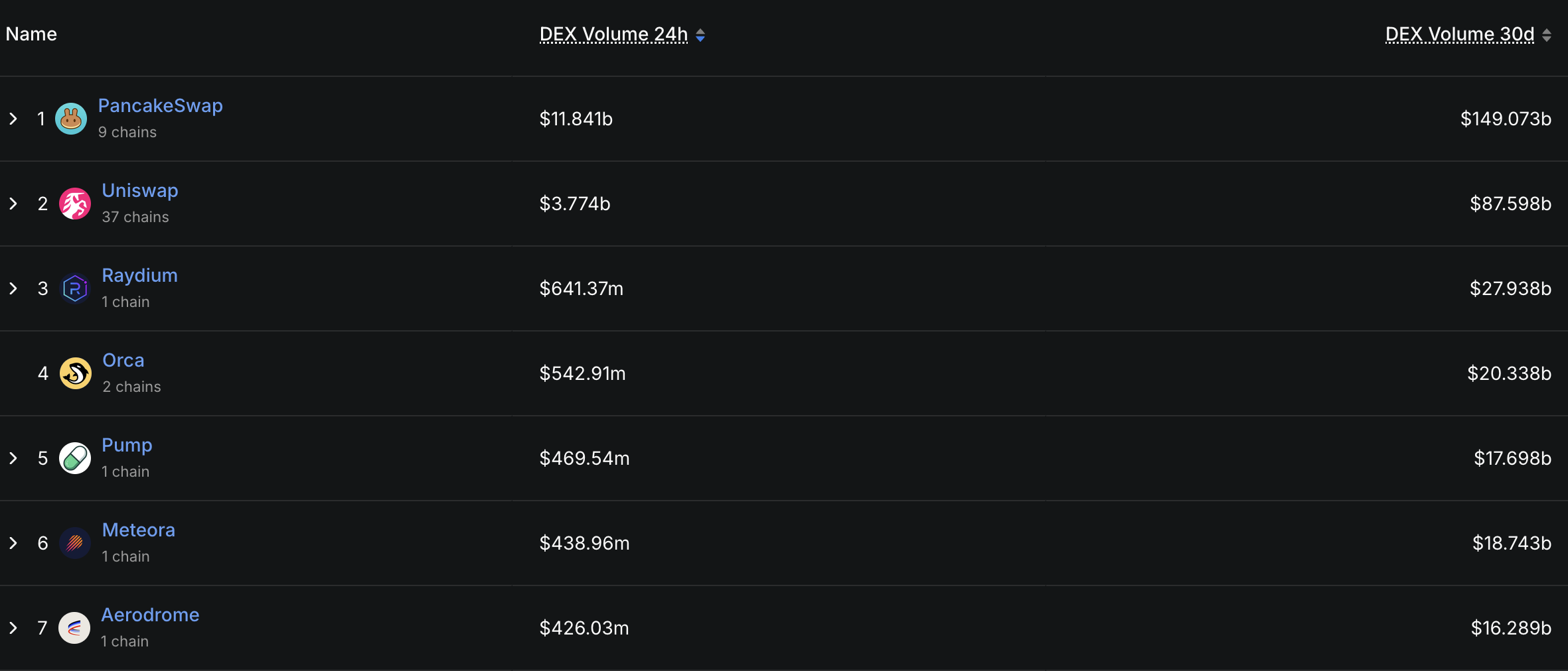 Já as taxas da PancakeSwap somaram mais de US$ 120 milhões nos últimos 30 dias. Isso colocou a plataforma entre as três principais, superando até mesmo a Pump.fun, nome expressivo no espaço DeFi.