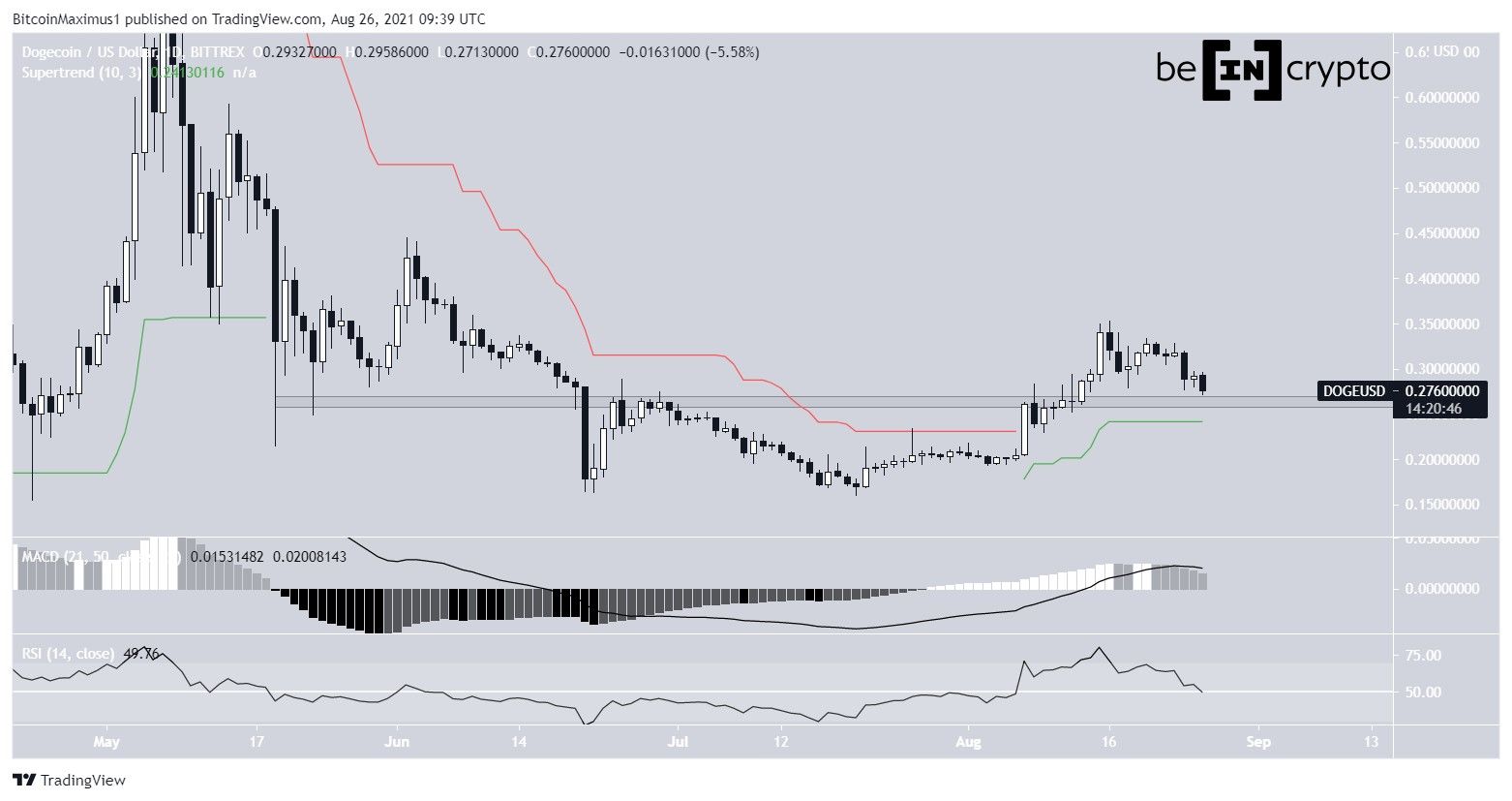 A Dogecoin (DOGE) ultrapassou a área horizontal de US$ 0,265 em 11 de agosto e está atualmente em processo de validação deste nível como suporte.