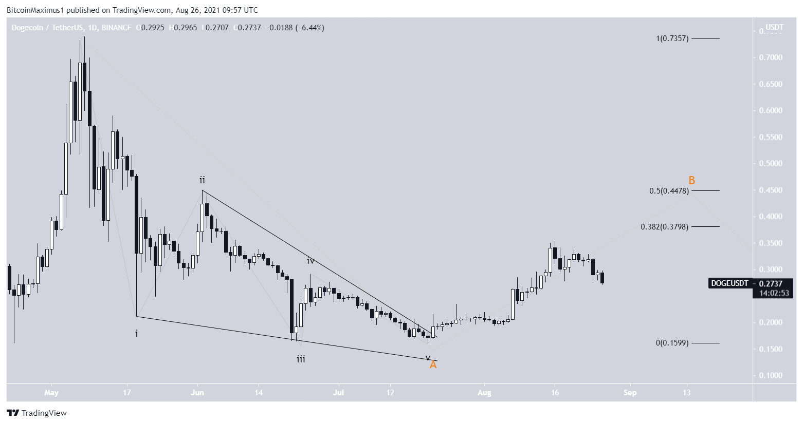 O DOGE iniciou um movimento de alta em 22 de junho e criou um topo mais alto em 20 de julho. No dia 11 de agosto, a criptomoeda conseguiu ultrapassar a área de resistência horizontal de US$ 0,265, atingindo o preço de US$ 0,352 em 16 de agosto.
