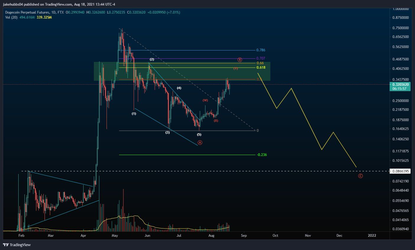 O trader de criptomoedas @TheTradingHubb esboçou um gráfico da DOGE, afirmando que o token está completando uma onda B de longo prazo antes de outra queda acentuada.