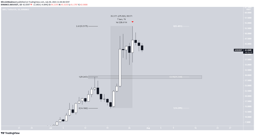 O AXS cai desde então. O nível de suporte significativo mais próximo está em US$ 29,23, o nível de suporte de retração de Fibonacci de 0,618 e a máxima histórica anterior.