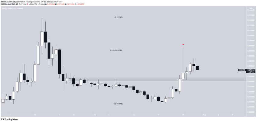 Desde então, o AMP está tentando encontrar um suporte. A principal área de suporte é encontrada em US$ 0,065.