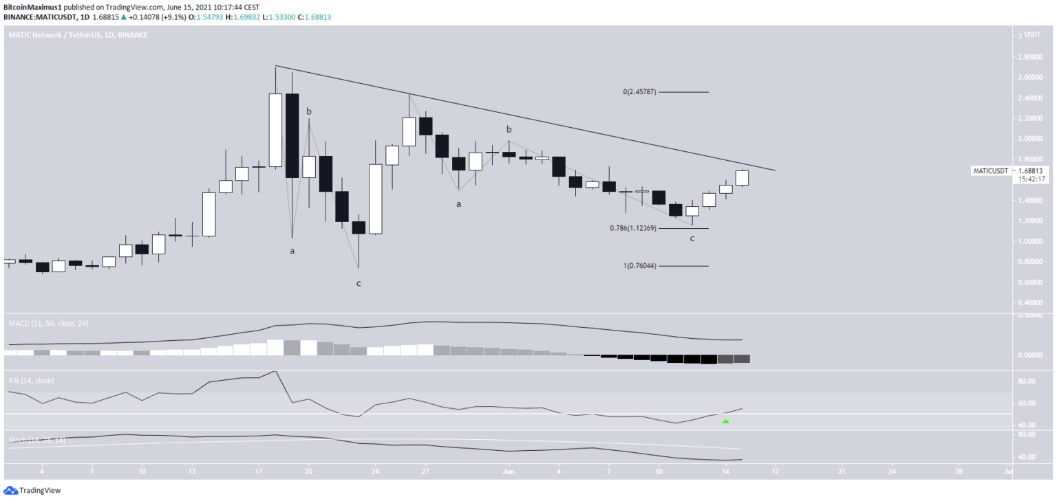 MATIC tem seguido uma linha de tendência de baixa desde 18 de maio. A moeda criou um topo mais baixo no 26 e está atualmente fazendo outra tentativa de romper essa linha.