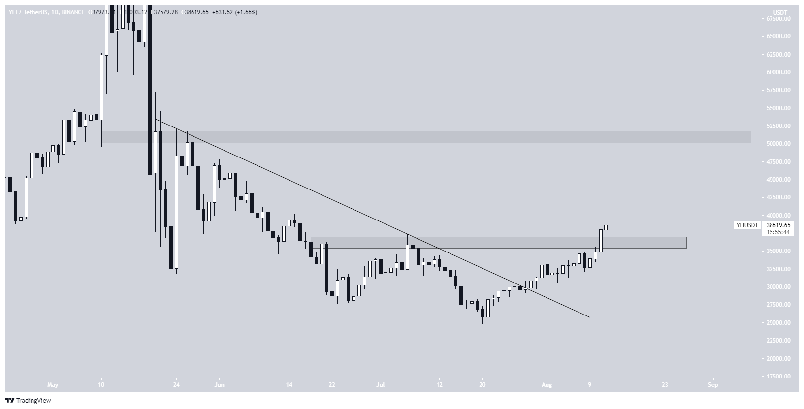 A YFI também está subindo desde 20 de julho. Em 28 de julho, ela conseguiu romper sua linha de tendência de baixa.