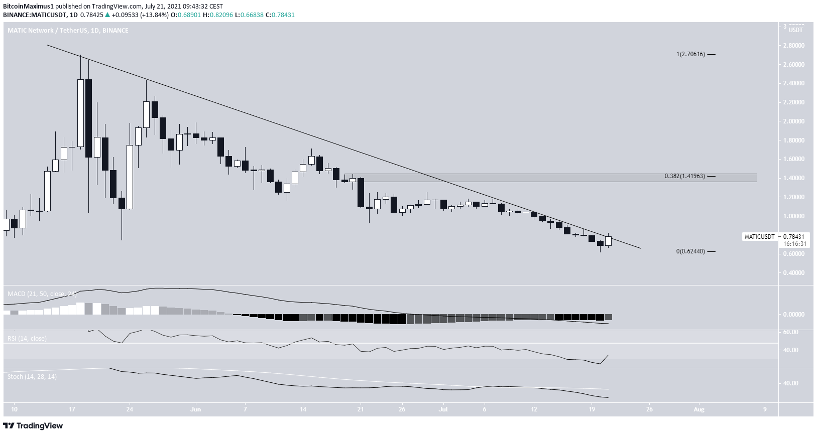 A MATIC tem caído ao longo de uma linha de tendência de baixa desde 18 de maio, após atingir um topo de US$ 2,70. Até agora, a moeda atingiu um fundo de US$ 0,62 na última terça-feira.