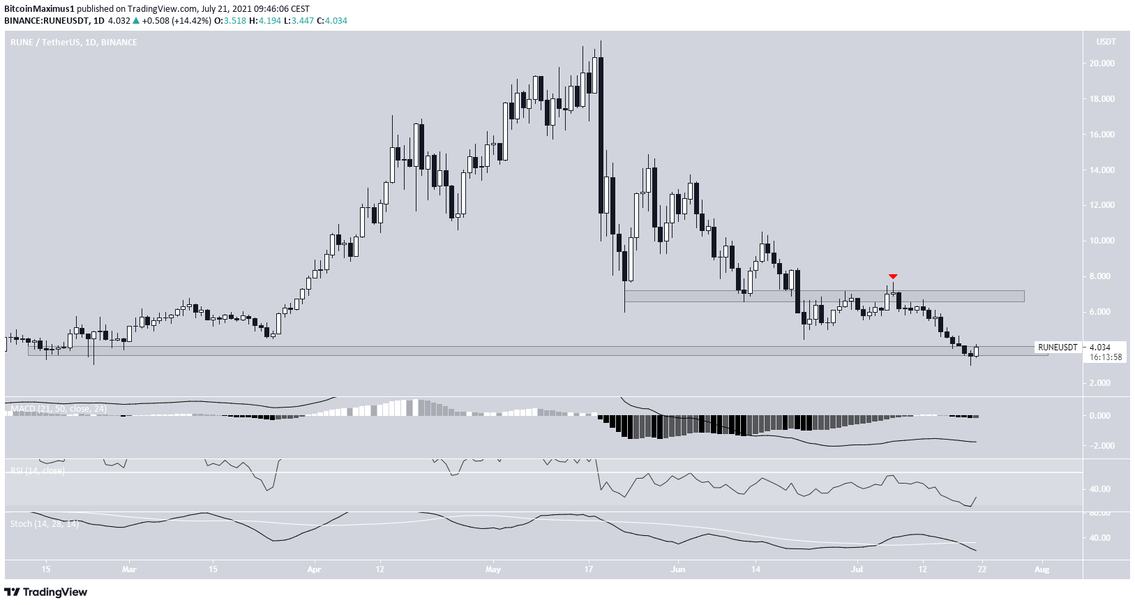 A RUNE está em tendência de baixa desde 7 de julho, após não conseguir superar a resistência de US$ 7 (ícone vermelho).