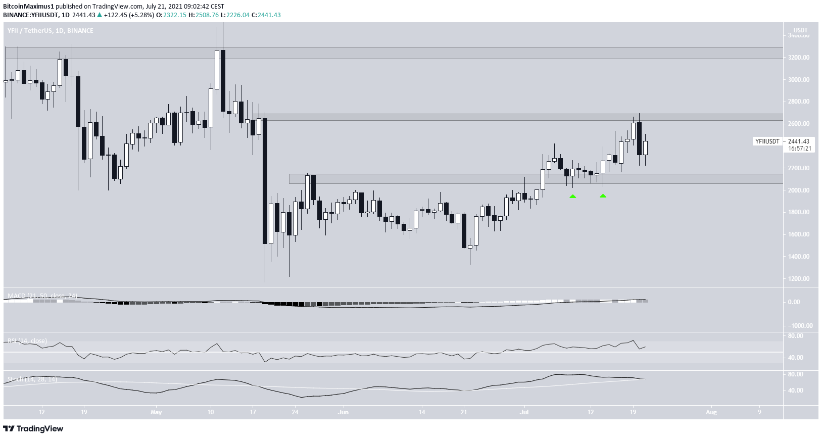 A YFII está em alta desde 19 de maio, criando um fundo mais alto que o anterior em 22 de junho. No dia 5 de julho, a criptomoeda rompeu a resistência de US$ 2.120, a validando como suporte alguns dias depois (ícone verde).
