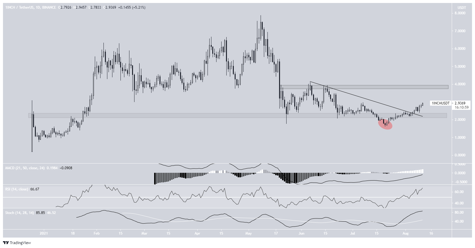 Em 17 de julho, a 1INCH parecia ter rompido abaixo do suporte horizontal de US$ 2,20 (círculo vermelho). No entanto, a moeda recuperou o nível pouco tempo depois e tem subido desde então.