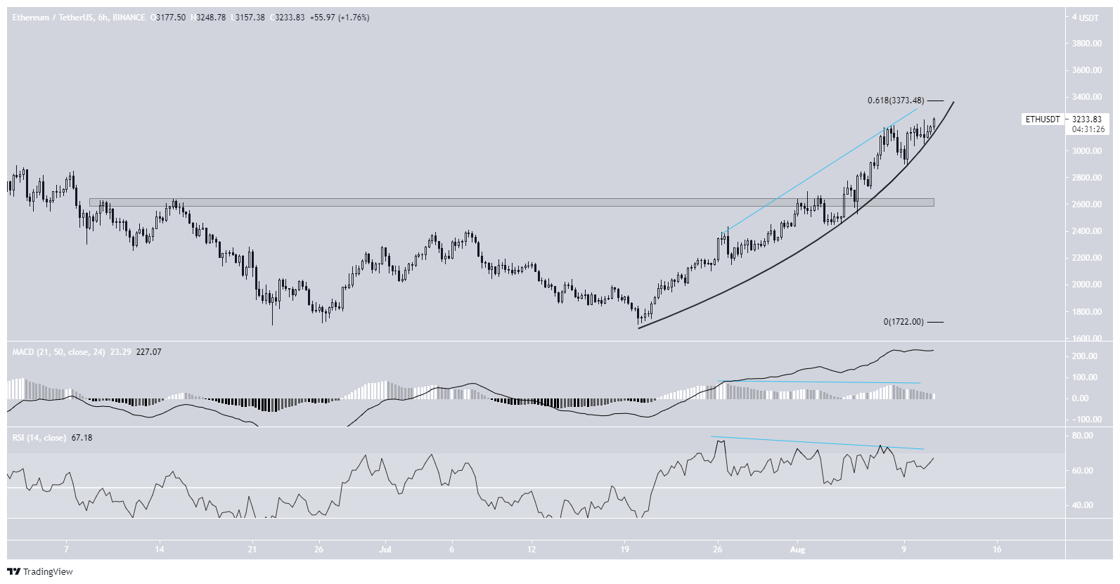 A ETH está se aproximando do nível de retração de 0,618 de Fibonacci, em US$ 3.370. Além disso, tanto o MACD quanto o RSI geraram divergências de baixa. Portanto, é possível que algum tipo de correção do movimento atual ocorra após a moeda atingir este nível.
