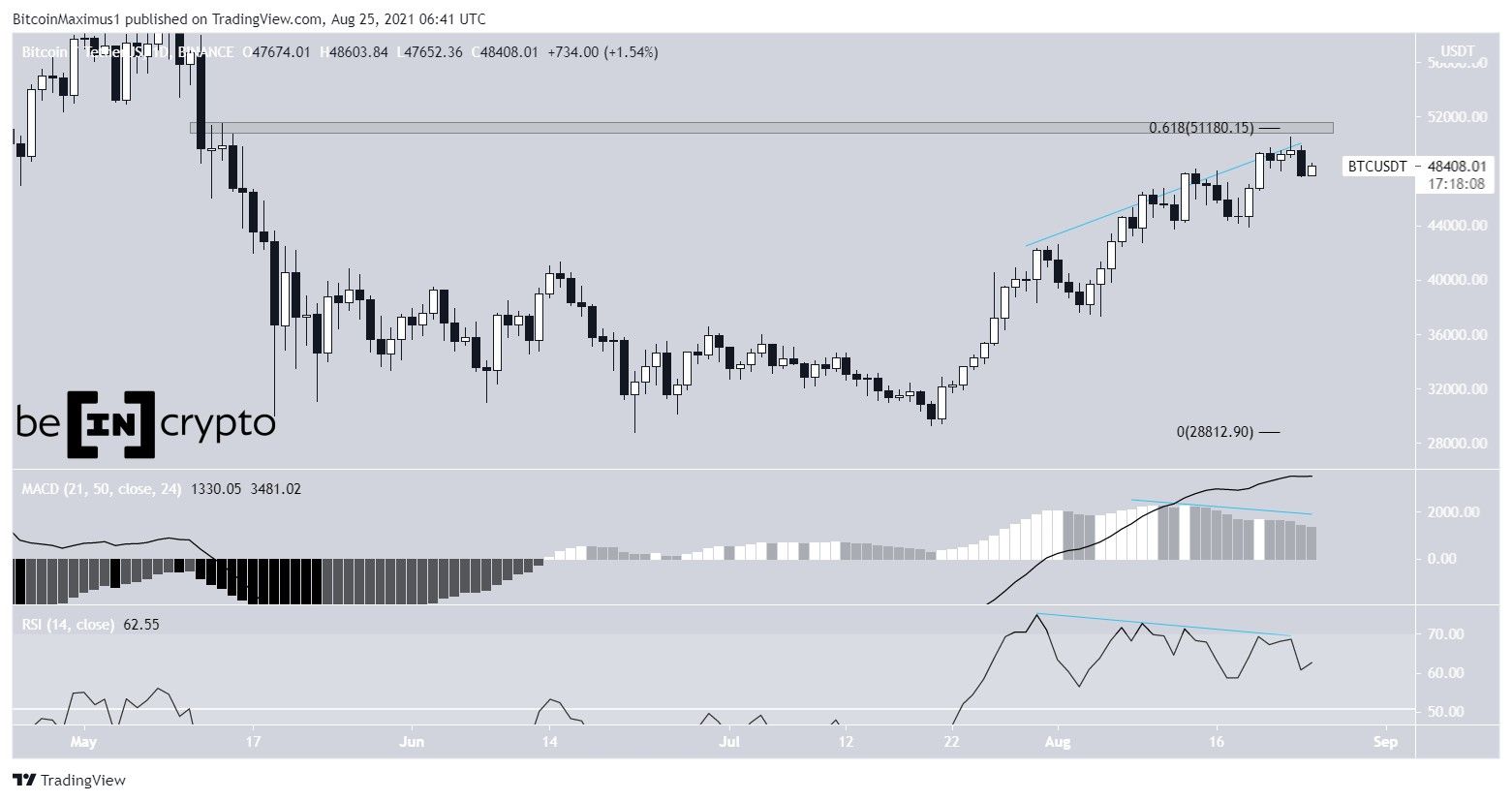 O BTC não conseguiu se mover acima da área de resistência de US$ 51.200. Esta é uma área de resistência horizontal e o nível de retração de 0,618 de Fibonacci.