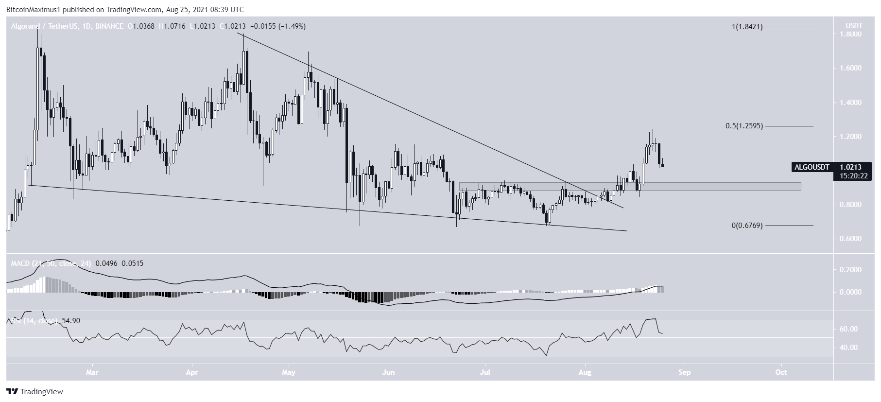 A ALGO está subindo desde que saiu de uma cunha de baixa em 6 de agosto. O movimento de alta continuou até que o preço de US$ 1,24 foi alcançado no domingo. A alta foi feita muito perto do nível de retração de 0,5 de Fibonacci, em US$ 1,26.