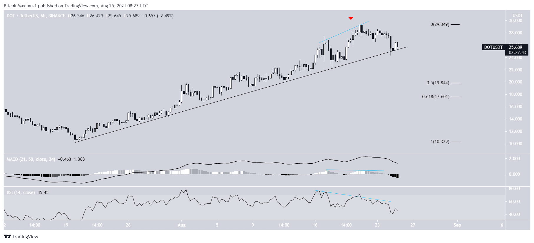 A queda foi precedida por divergências de baixa no RSI e no MACD. Até o momento, a DOT estava sendo negociada logo acima da linha de tendência de alta. Um rompimento abaixo dessa linha pode causar uma queda até US$ 17,60 – US$ 19,80.