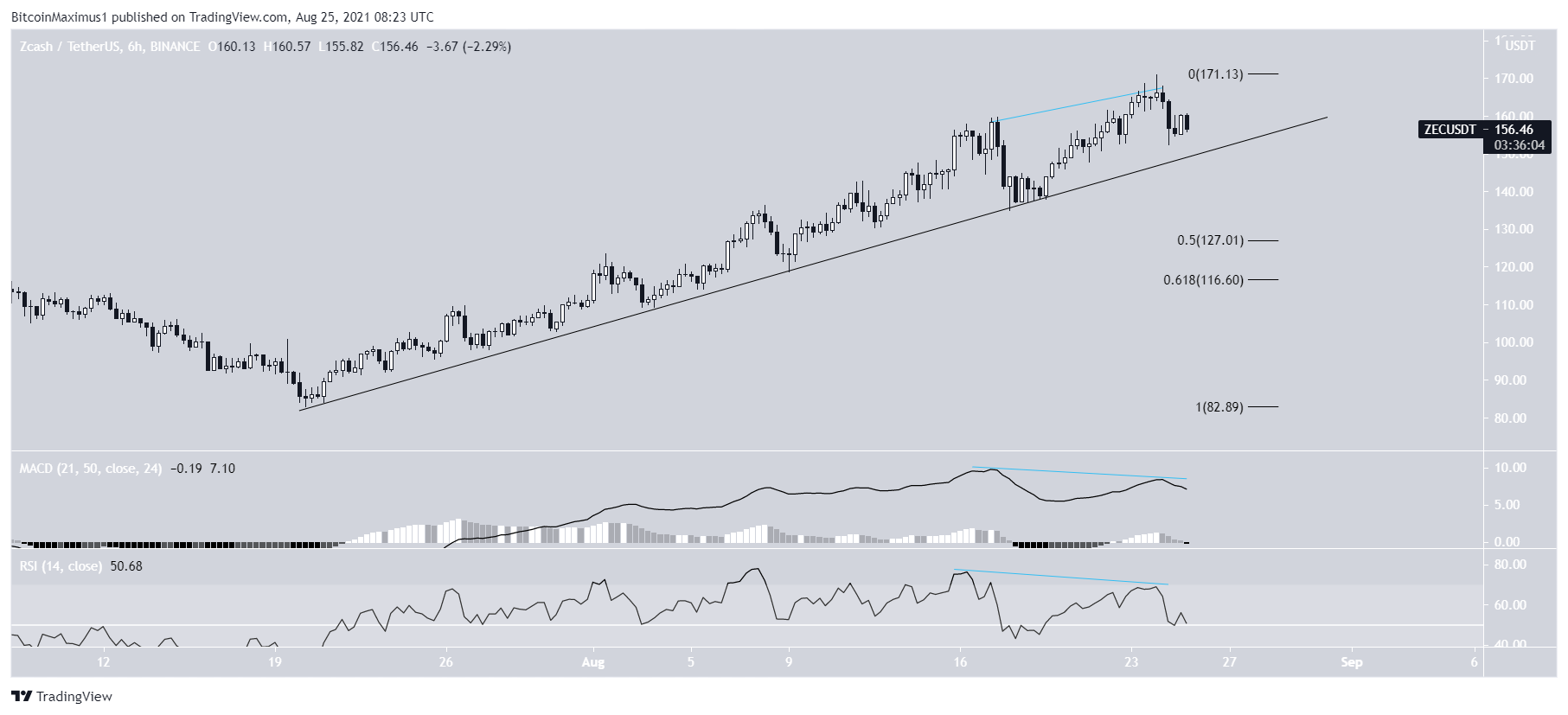 ZEC está subindo ao longo de uma linha de tendência de alta desde 20 de julho. Enquanto seguia a linha, a moeda atingiu o preço de US$ 171 na terça-feira (24).