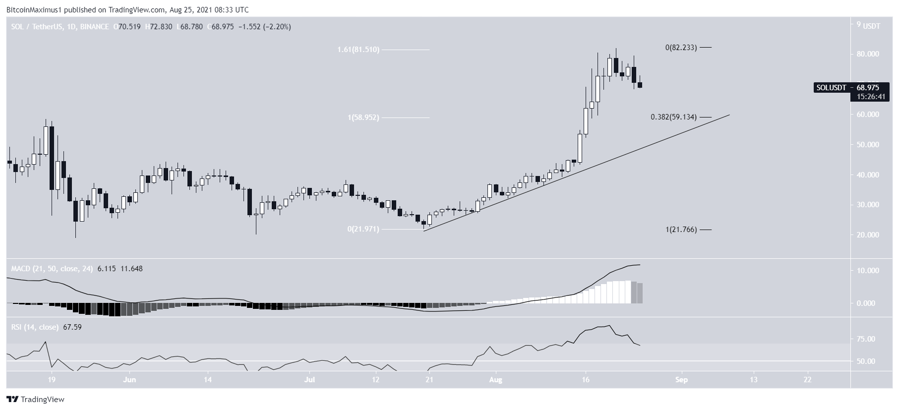 A SOL está em tendência de alta desde 20 de julho. No sábado, a criptomoeda atingiu o preço recorde de US$ 82. A alta foi feita no nível de retração externo de 1,61 de Fibonacci, ao medir a queda mais recente. O preço do ativo está caindo desde então.
