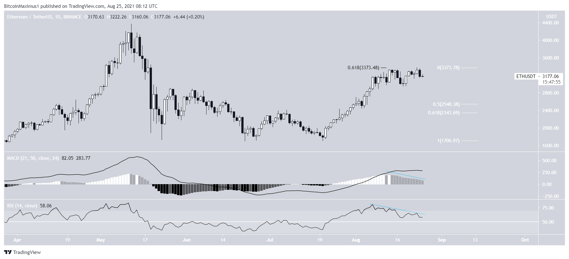 Apesar da queda, o ativo conseguiu se recuperar e atingiu uma alta de US$ 3.377 na segunda-feira. A alta foi atingida no nível de retração de 0,618 de Fibonacci. Isso criou um padrão de topo duplo, que foi combinado com divergências de baixa no MACD e no RSI.