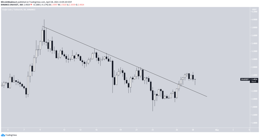 O gráfico de seis horas mostra um rompimento contínuo de uma linha de tendência de baixa. Portanto, espera-se que a ENJ alcance a área anteriormente delineada em US$ 2,85. No entanto, atualmente, não se pode determinar se isso ocorrerá.