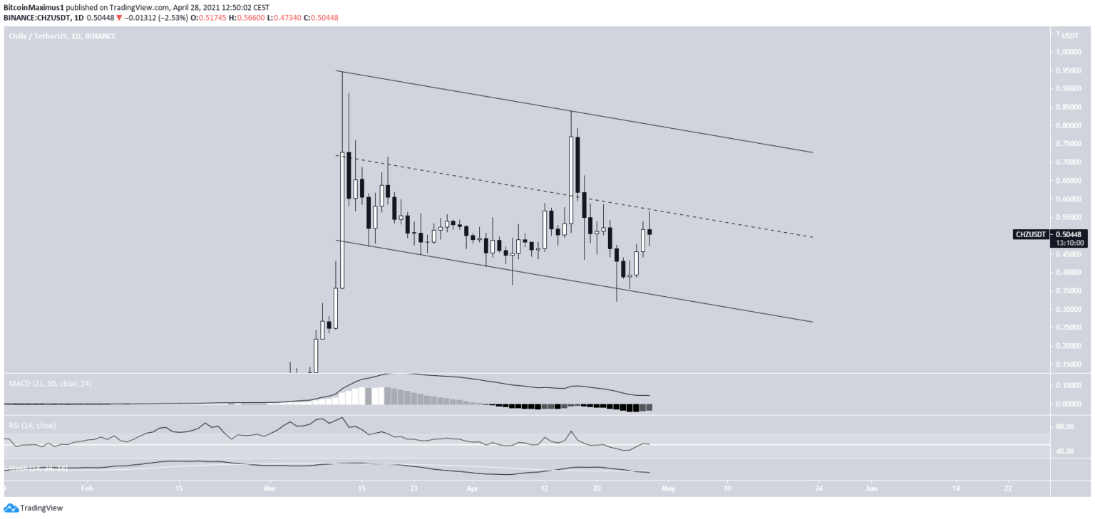 A CHZ tem estado numa tendência de baixa desde que atingiu seu preço recorde de US$ 0,94 no dia 12 de março. Embora o token tenha iniciado uma alta em 7 de abril, ele só conseguiu chegar nos US$ 0,84 e outra queda se seguiu depois. Até o momento, a CHZ atingiu a mínima de US$ 0,321, em 23 de abril.