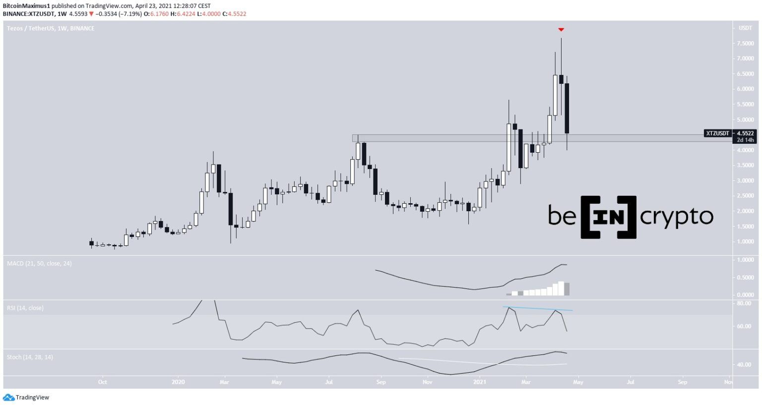 A XTZ vem caindo desde o último sábado (17), quando atingiu a máxima histórica de US$ 7,68. Com isso, a moeda voltou à área de suporte de US$ 4,50. A queda foi precedida por divergência de baixa no RSI semanal.
