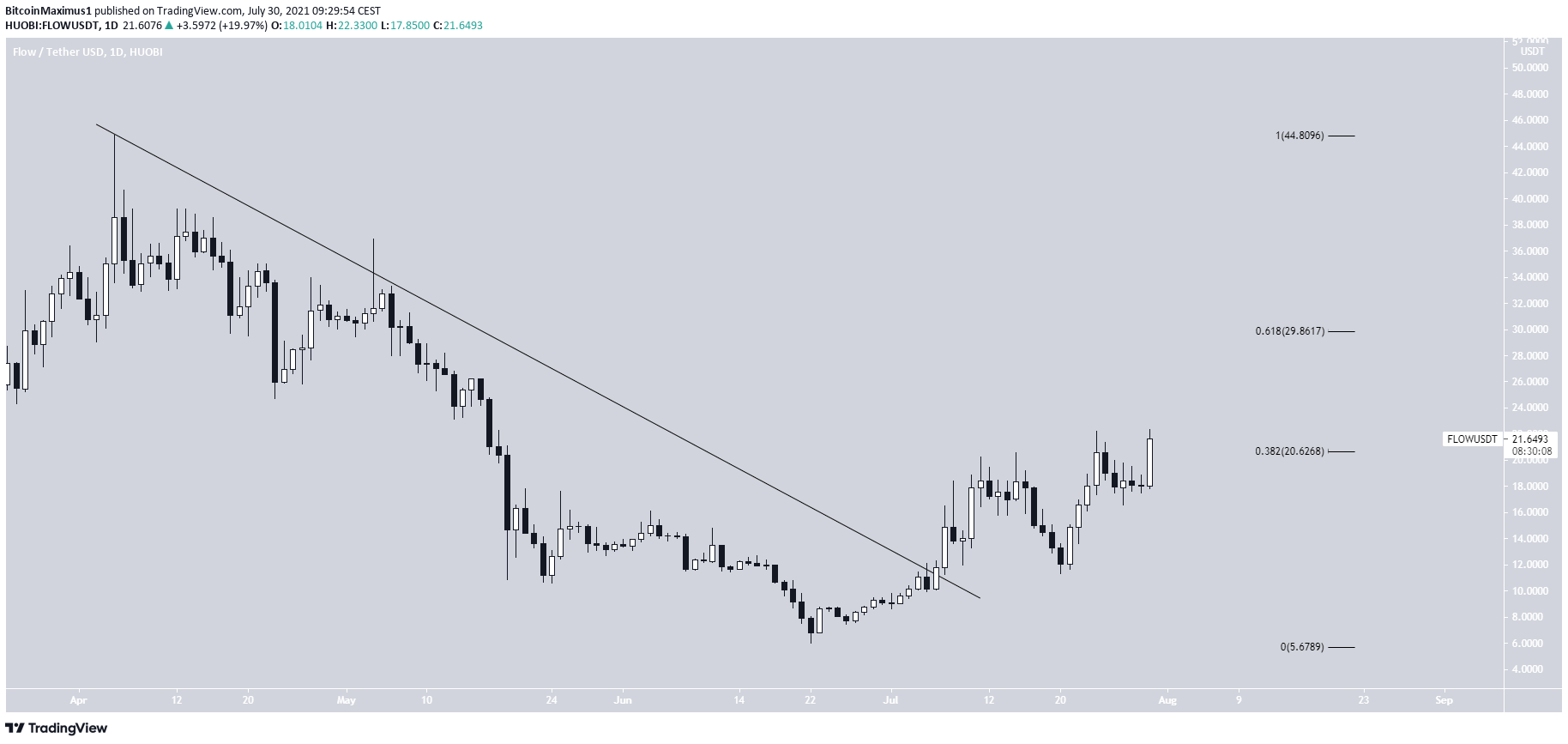 O FLOW criou um fundo maior que o anterior e voltou a subir no dia 20 de julho. Atualmente, a moeda está em processo de novo rompimento da linha de tendência mencionada. Caso o movimento seja bem-sucedido, o ativo pode subir em direção a US$ 29,86.