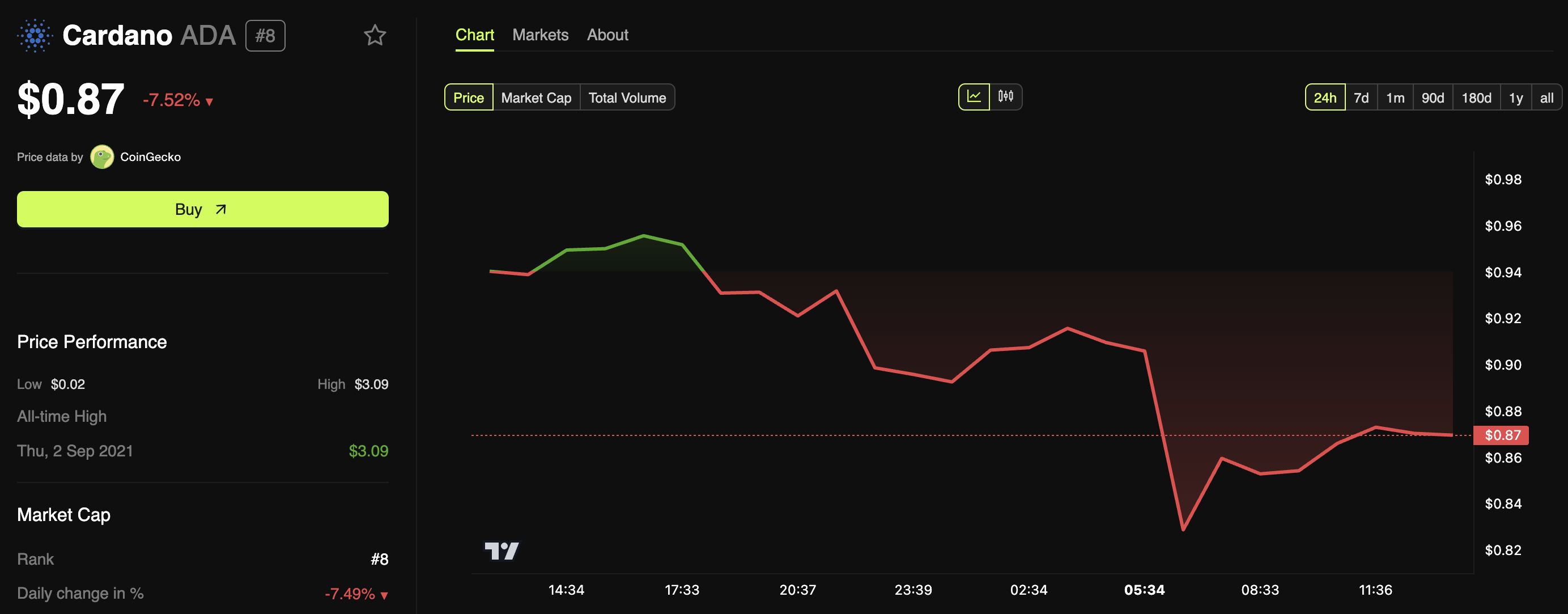 No entanto, os ganhos foram de curta duração. Após a ordem executiva do Presidente Trump para uma reserva estratégica de Bitcoin, o Bitcoin (BTC) e outras altcoins sofreram uma queda. No momento da publicação, ADA estava sendo negociada a US$ 0,87, refletindo uma queda de 7,52% no último dia.