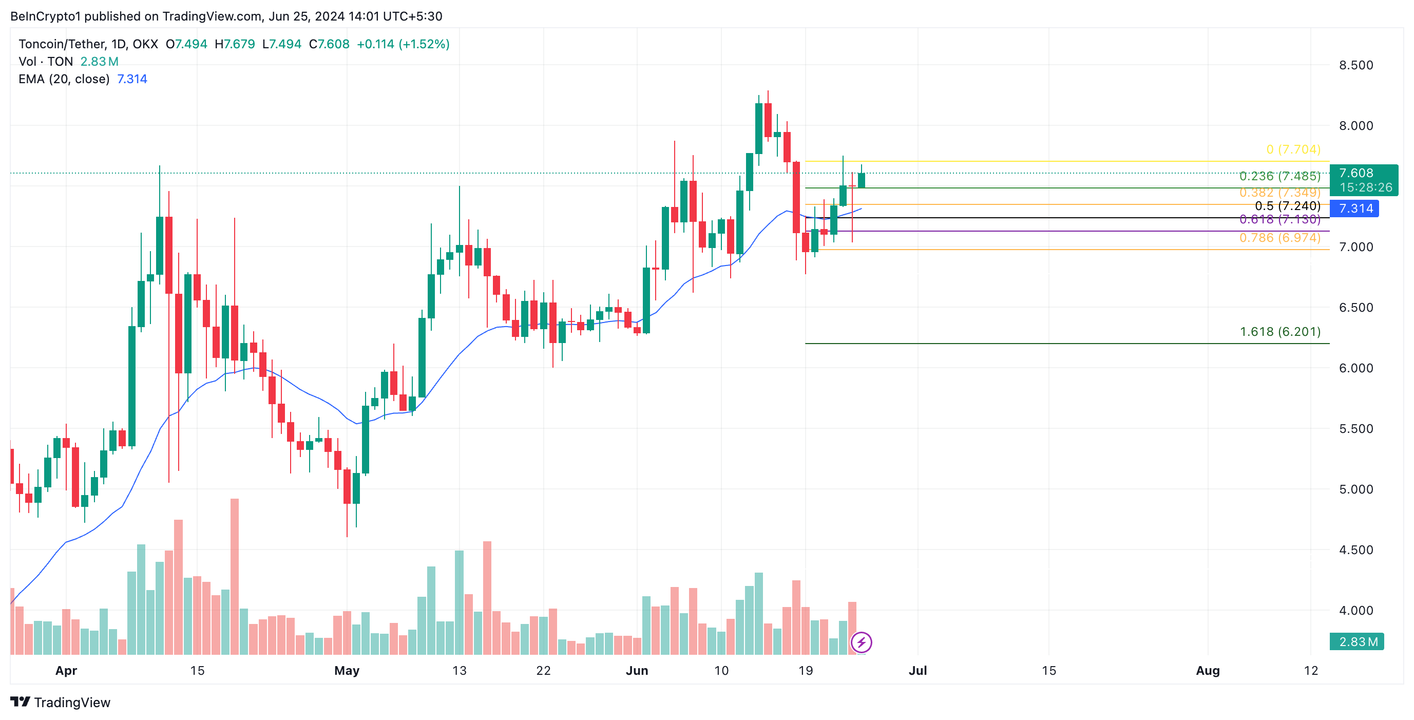 Até o momento, a TON está sendo negociada a US$ 7,57. Uma avaliação do desempenho de seu preço em um gráfico diário mostra que ele ultrapassou recentemente a média móvel exponencial (MME) de 20 dias.