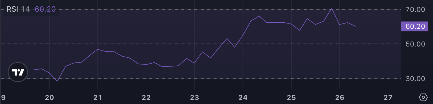 O RSI da PENGU está em 60,2, após subir de menos de 50 há dois dias e sair da sobrecompra (70). Isso reflete forte impulso de compra seguido por leve retração.