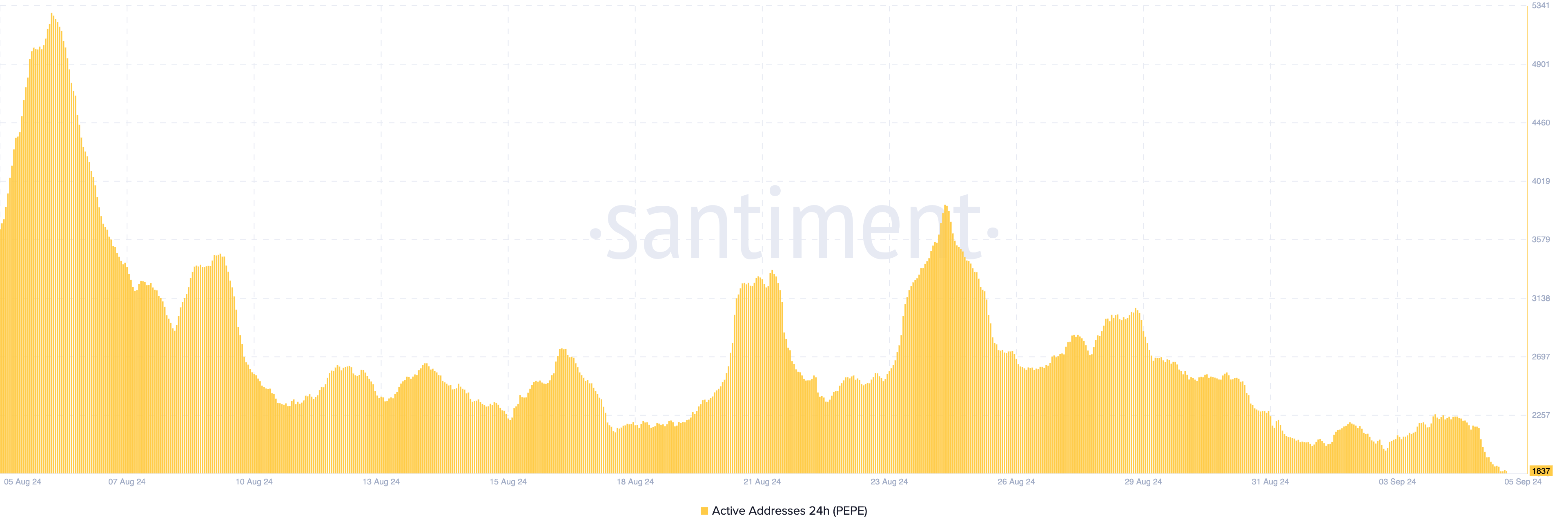 Primeiramente, os endereços ativos de Pepe, que alcançaram um pico impressionante na primeira semana de agosto, caíram para o menor nível desde fevereiro. O indicador de endereços ativos é crucial para qualquer projeto de criptomoeda, pois mede o nível de interação do usuário.