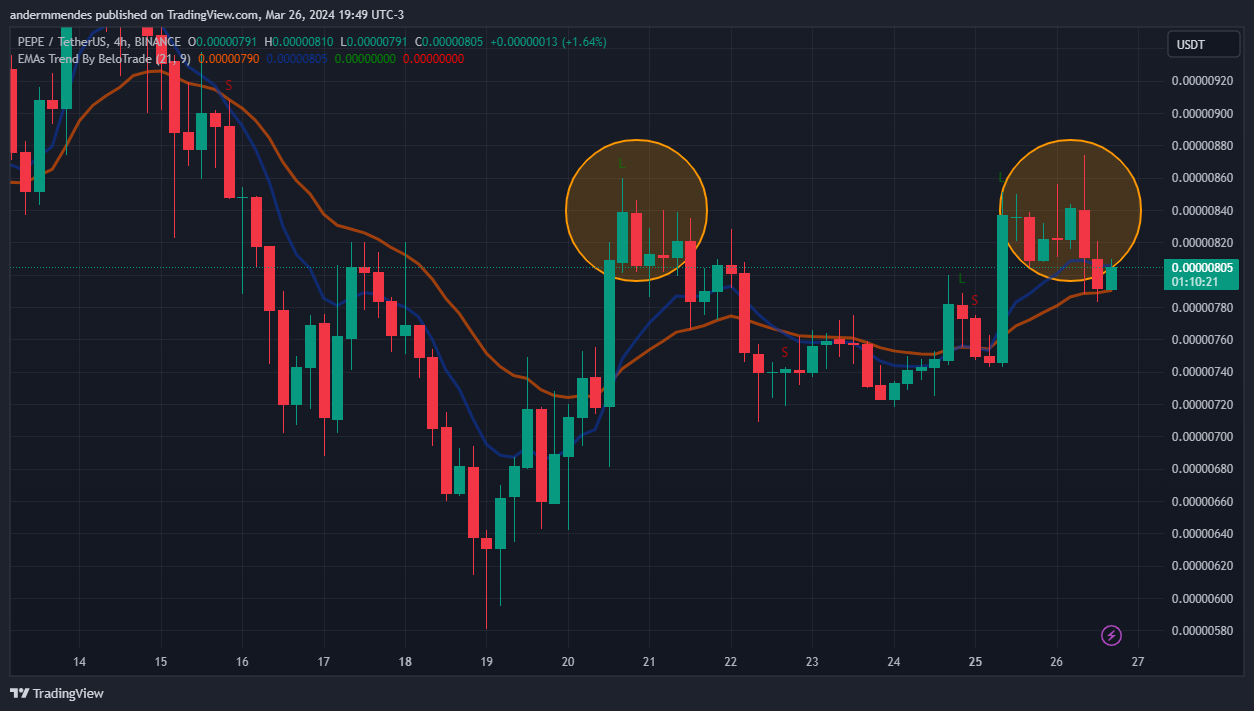 Um movimento acima do topo duplo, em US$ 0,00000880 confirmaria que a tendência é de alta. Por outro lado, novas quedas e um cruzamento da EMA de 21 períodos abaixo da EMA de 9 indicaria que a PEPE deve buscar novos fundos de preço.