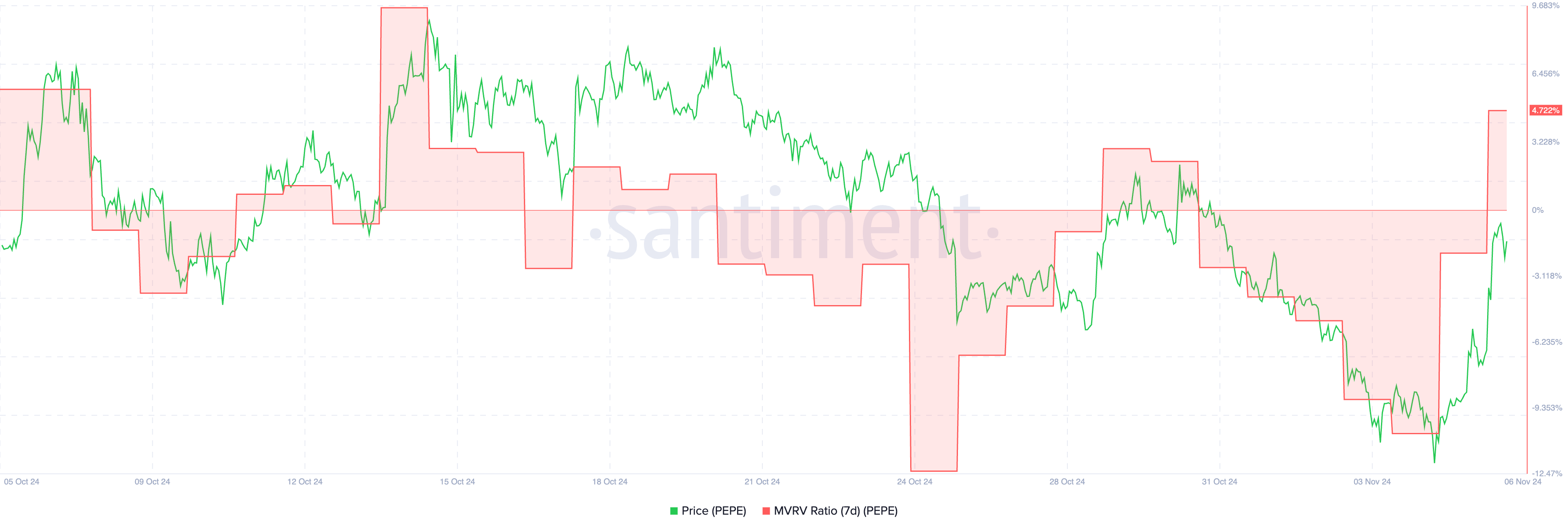 A relação MVRV de 7 dias da PEPE subiu para 4,7%, um aumento notável de -10% há apenas dois dias, indicando que os compradores recentes estão agora vendo ganhos. A relação MVRV (Valor de Mercado para Valor Realizado) de 7 dias mede o lucro ou prejuízo médio dos detentores que adquiriram o ativo na última semana.