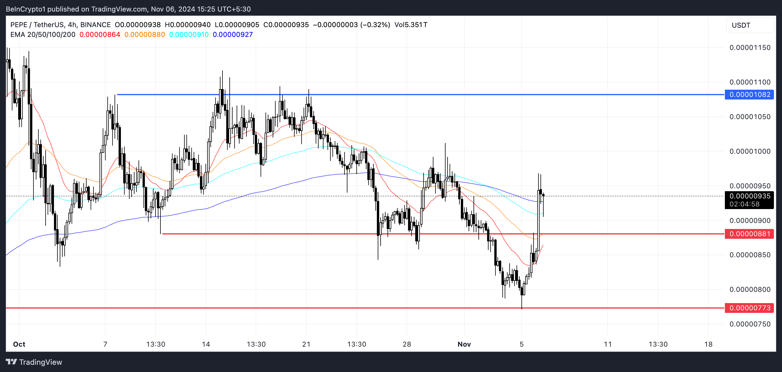 No entanto, o recente aumento no preço da PEPE fez com que a lacuna entre essas EMAs se estreitasse, sugerindo que o ímpeto pode estar mudando. Se essa tendência continuar, uma cruz dourada poderá aparecer em breve, onde EMAs de curto prazo cruzam acima das de longo prazo, um sinal altista que frequentemente marca o início de uma tendência de alta mais forte.
