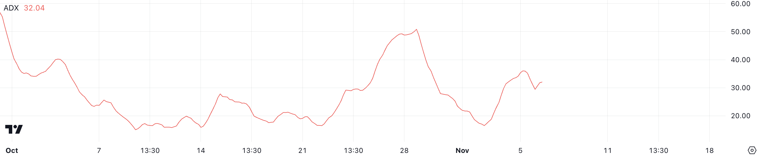 O ADX da PEPE subiu para 32, um aumento significativo de abaixo de 20 há apenas alguns dias, sinalizando que a força de sua tendência atual está ganhando impulso. O ADX, ou Índice Direcional Médio, mede a força de uma tendência sem indicar sua direção.