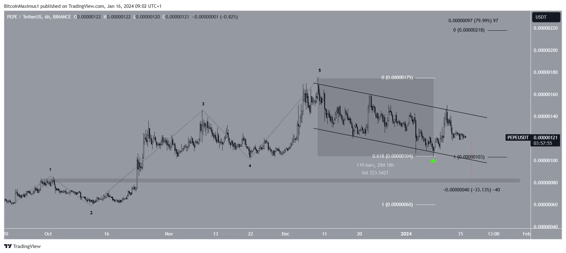 A contagem mais provável sugere que a PEPE completou um movimento de cinco ondas (preto) e agora está em correção. Ela foi contida dentro de um canal paralelo de baixa, o que é comum.