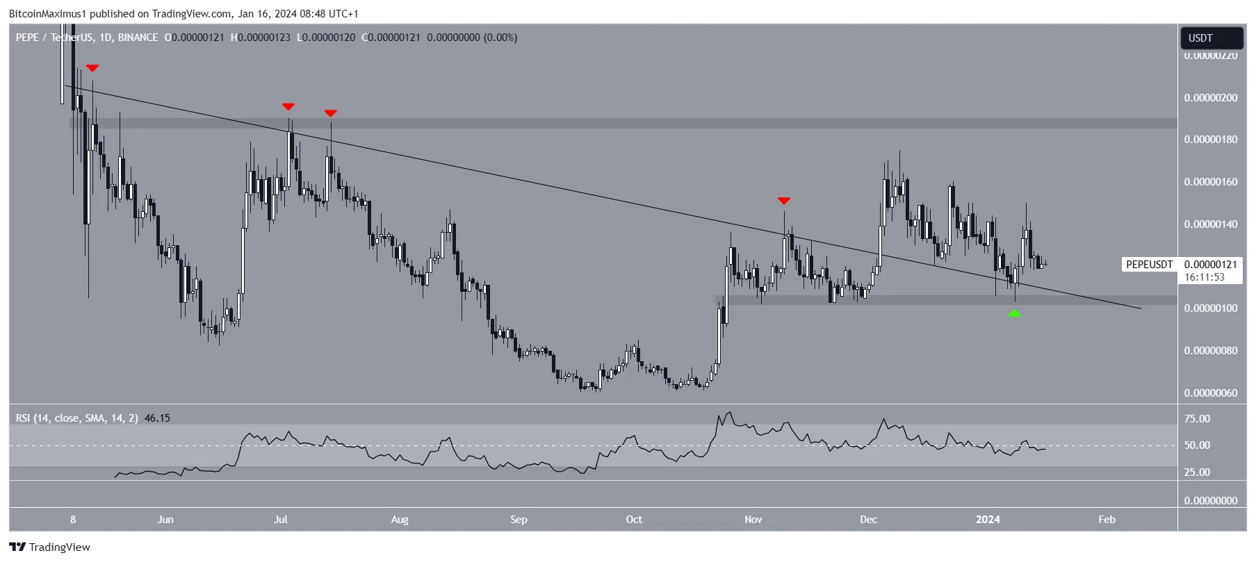 Após atingir o topo em 9 de dezembro, a PEPE começou a cair e retornou à linha de tendência de baixa, validando-a como suporte em 8 de janeiro (ícone verde) e saltando.