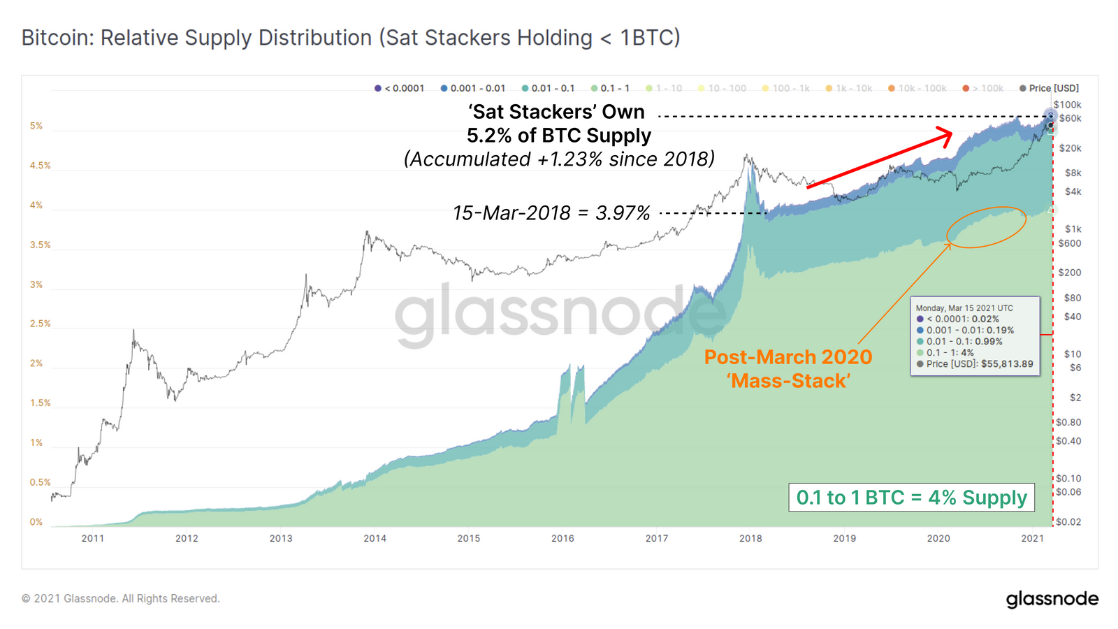 Em março de 2018, os sat stackers detinham 3,97% do fornecimento total de bitcoin na época. Desde então, essa porcentagem cresceu e hoje 5,20% de todo BTC já minerado está nas mãos dos pequenos detentores.