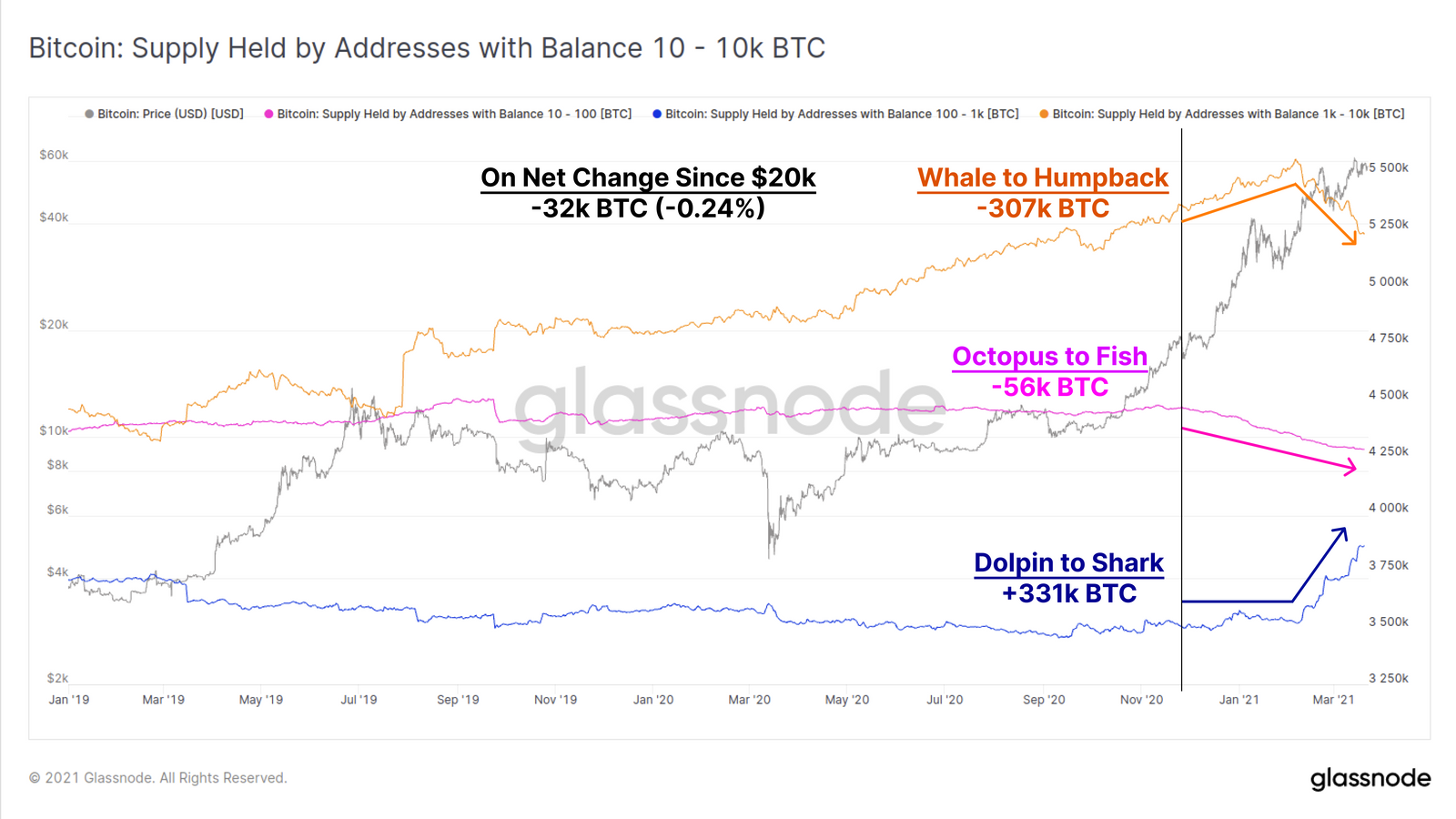 De acordo com o relatório, desde dezembro de 2020 os pequenos acumuladores adquiriram cerca de 29,8 mil BTC. Ao mesmo tempo, as grandes baleias diminuíram em 32 mil BTC suas participações. Ou seja, a riqueza em bitcoin está gradualmente sendo transferida de um lado para o outro, reduzindo a concentração no mercado.