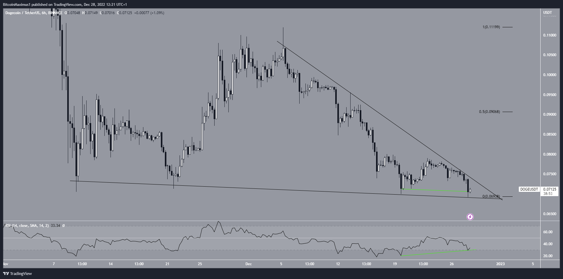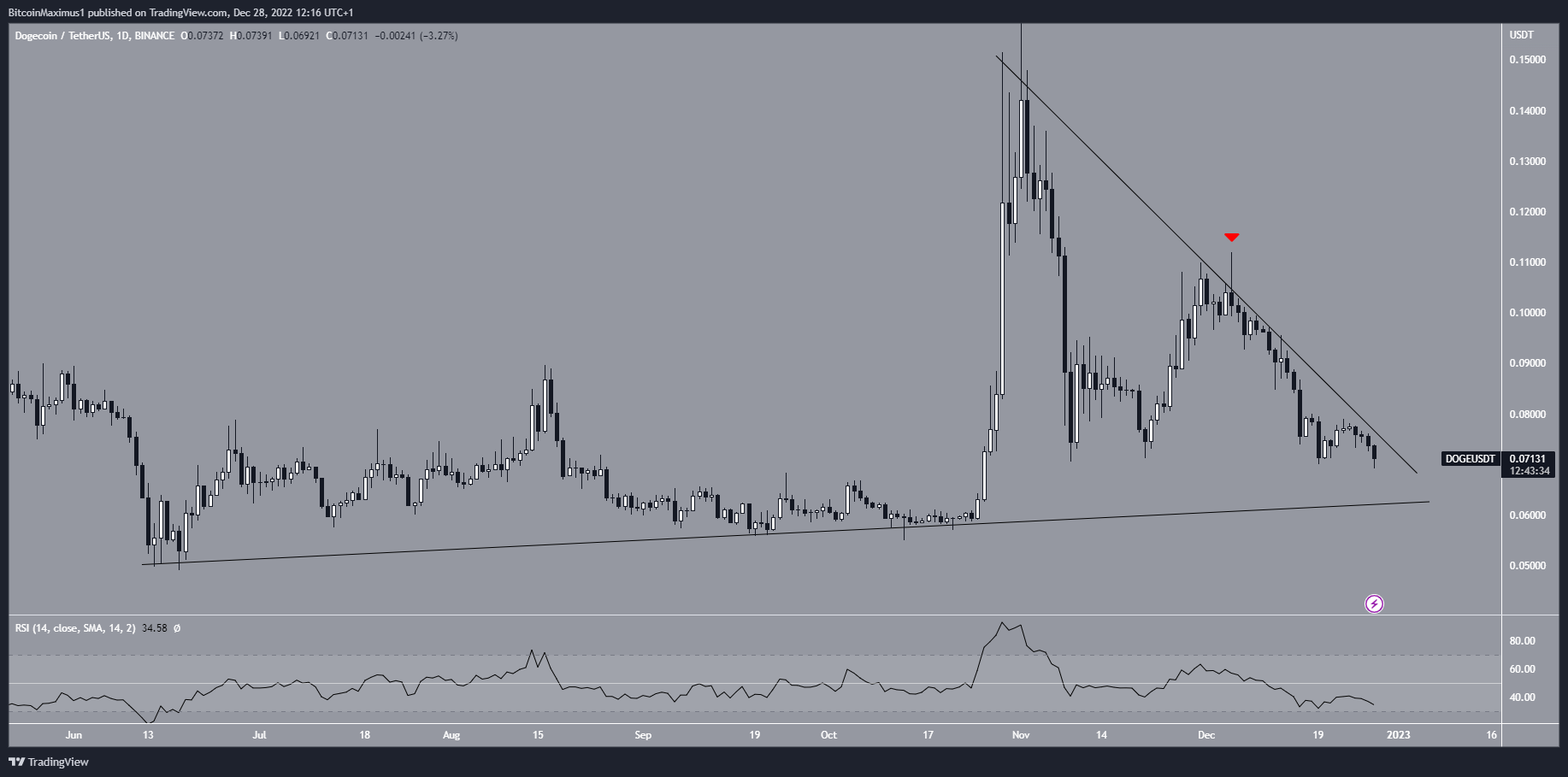 O preço da DOGE caiu abaixo de uma linha de tendência de baixa no dia 29 de outubro. Mais recentemente, a linha causou uma queda em 5 de dezembro (ícone vermelho), catalisando o atual movimento de baixa, que levou a uma mínima de US$ 0,069 feita nesta quarta-feira (29). A movimento também fez com que o RSI diário caísse abaixo de 50.
