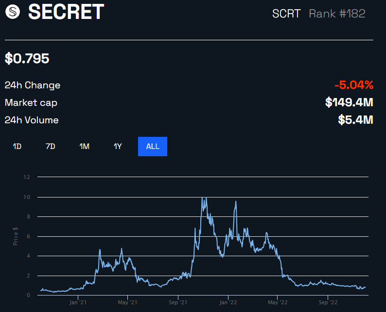 SCRT é o token nativo da rede. O token tem um valor de mercado totalmente diluído de US$ 152 milhões. Seu preço aumentou significativamente durante o mês de outubro, quando a discussão sobre moedas de privacidade estava ocorrendo na Europa.