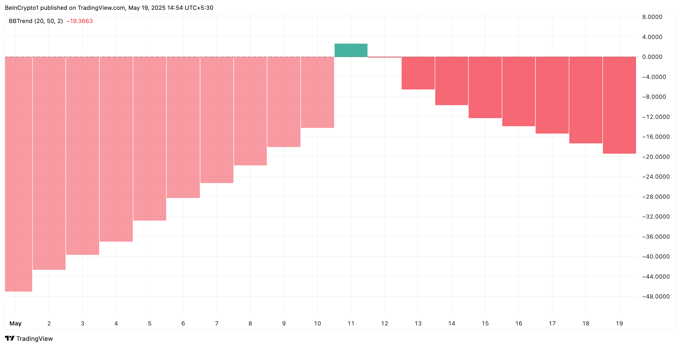 O BBTrend da Pi Network permanece no vermelho no gráfico diário, confirmando que as forças de baixa estão firmemente no controle. Observado em um gráfico de um dia, o indicador está atualmente em -19,36.