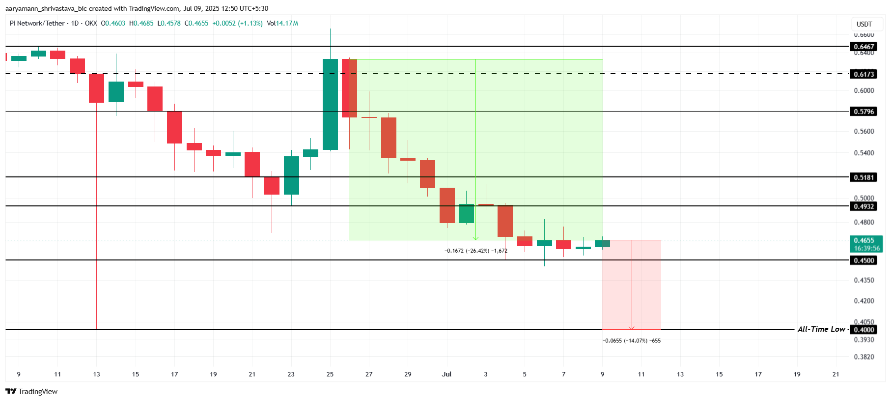 A Pi está atualmente cotada a US$ 0,465, logo acima do nível crítico de suporte de US$ 0,450. Com a altcoin pairando apenas 14% acima de sua mínima histórica de US$ 0,400, ela enfrenta um risco significativo de queda.