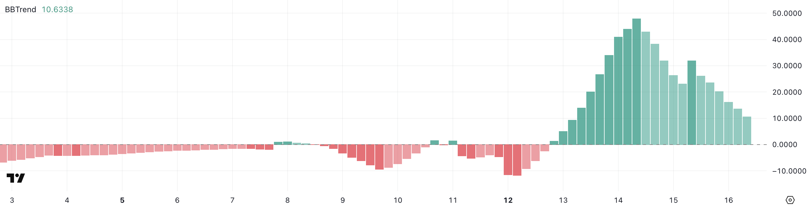 O indicador Bollinger Band Trend (BBTrend) da moeda caiu drasticamente para 10,63, após atingir quase 48 há apenas dois dias e cair para 32 ontem (15).